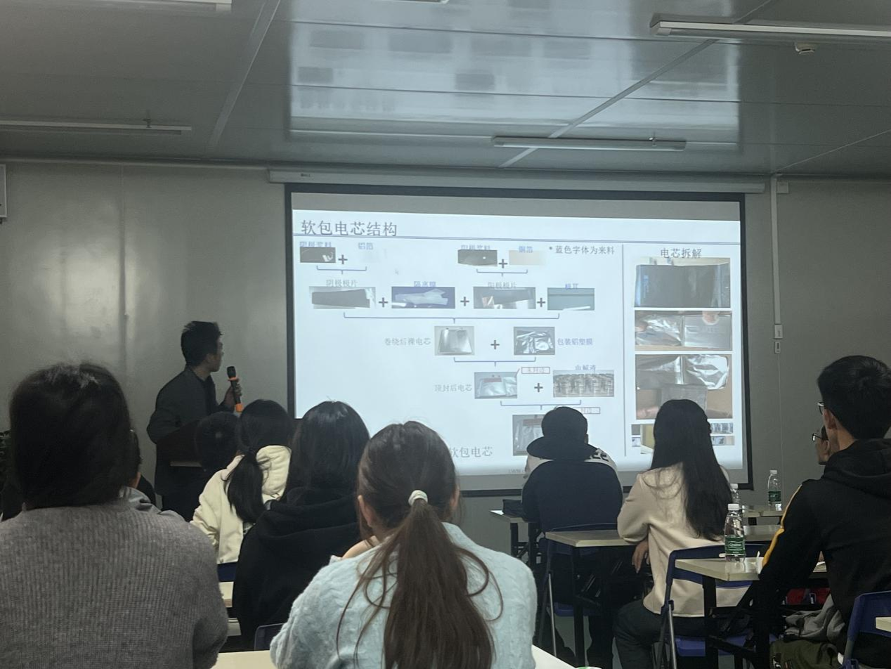 紧接着,培训的第二项,由企业相关高管及高级工程师介绍了企业文化和工艺技能。天贸的江经理详细介绍了产品特性、职业规划以及公司生活环境等方面的情况,帮助大家对公司有了更加全面和深入的了解。公司的杨工程师为大家详细讲解了锂离子电池生产工艺流程与关键参数管控,让大家对新能源电池的生产过程有了更为深入的了解。