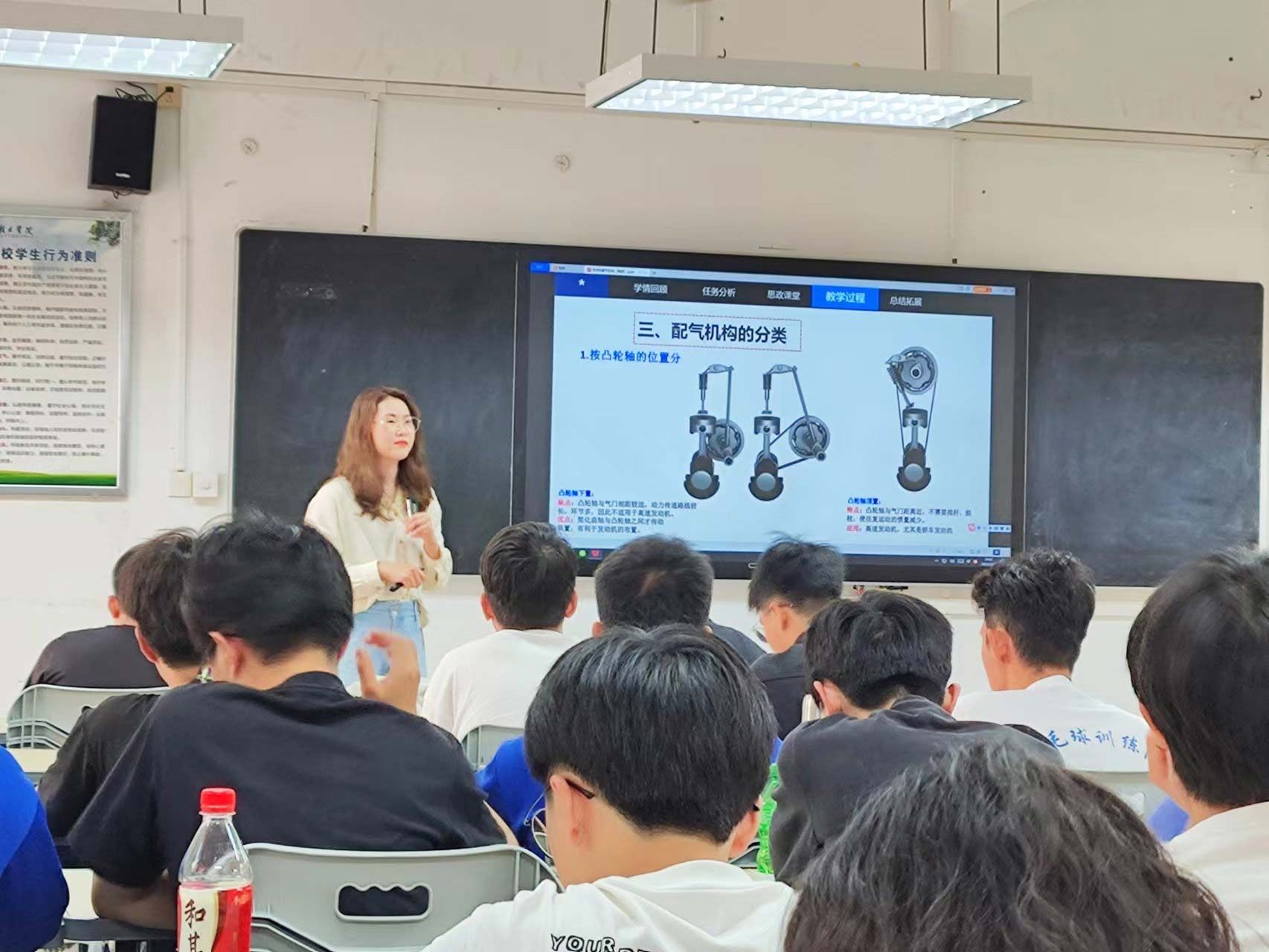 本次公开课由新能源汽车技术专业教师陈丽雅主讲,讲授内容为汽车发动机的配气机构。陈老师以影片中主角飚车片段引入发动机技术,介绍汽车发动机国内外差距,介入勉励同学们为我国汽车行业发展做出贡献的思政元素,再导入到发动机结构延展到汽车发动机配气机构,详细地介绍了配气机构的类型、组成、原理及工作要求等内容。整个教学过程中,陈老师深入浅出,教态自然,声音洪亮,举例贴近生活,语言风趣幽默,板书、课件、视频切换娴熟,教导与启发顺畅,显示出充分的课前准备和深厚的教学功底。