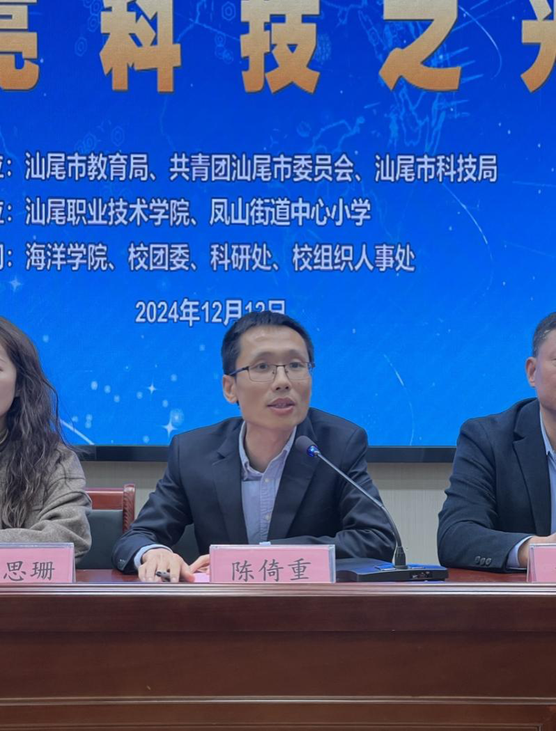 陈倚重讲话中指出,太阳成集团tyc作为汕尾市直属的唯一高校,海洋(机电)公司一直致力于提升地区青少年的科学素养。此次“科技进校园”活动是公司持续推动基础教育深化改革高质量发展的举措之一。他希望通过此次活动,能够让同学们近距离感受科技的魅力,激发他们对科学的热爱和追求。
