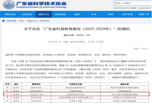 近日,广东省科学技术协会与广东省科学技术厅联合发布 “广东省科普教育基地(2025—2029 年)” 认定名单,公司申报的电子信息科普创新教育基地成功获批,这也是公司首个省级科普教育基地。