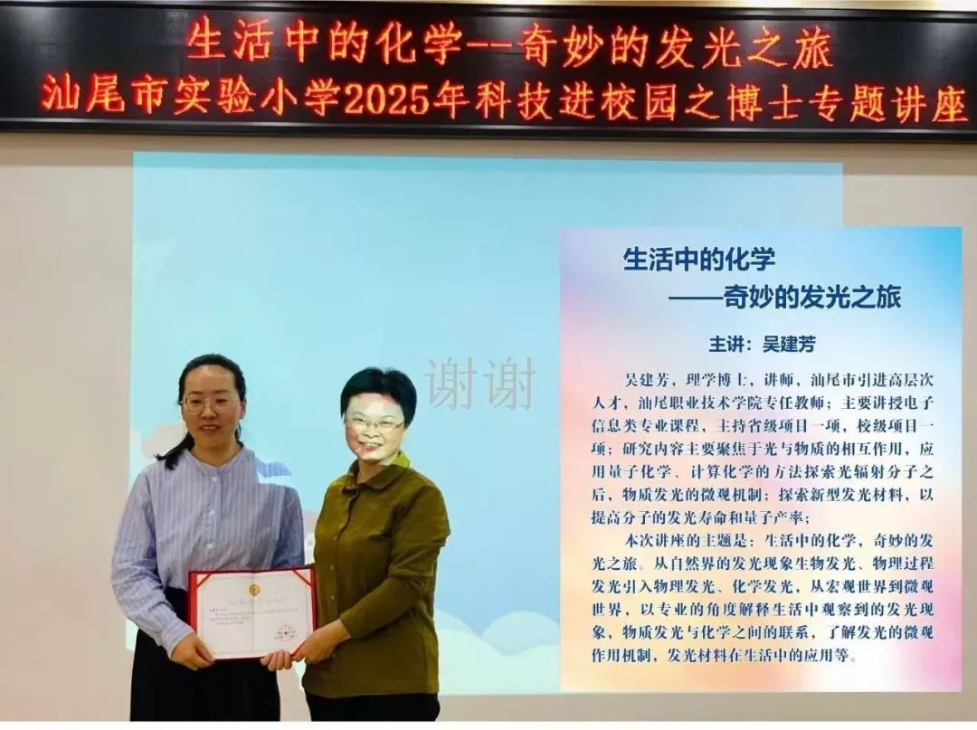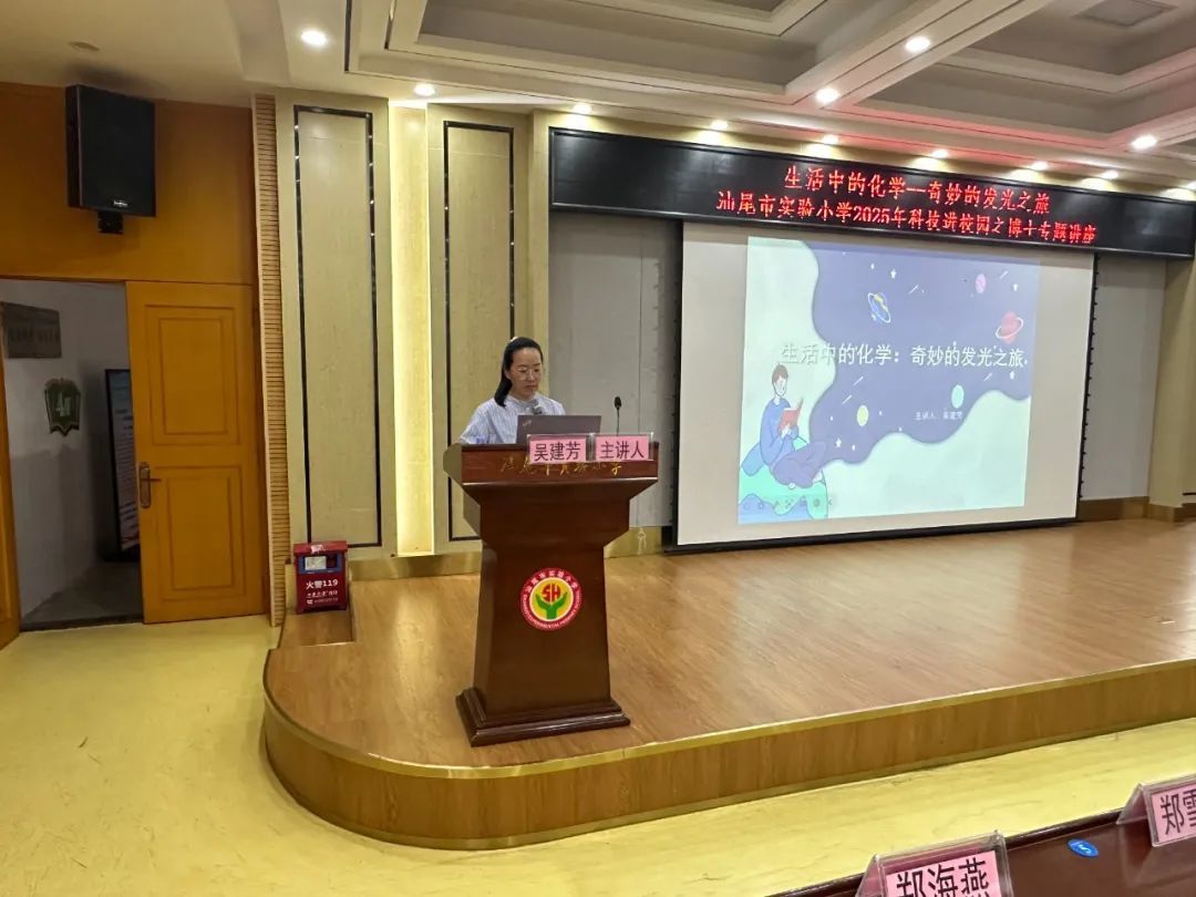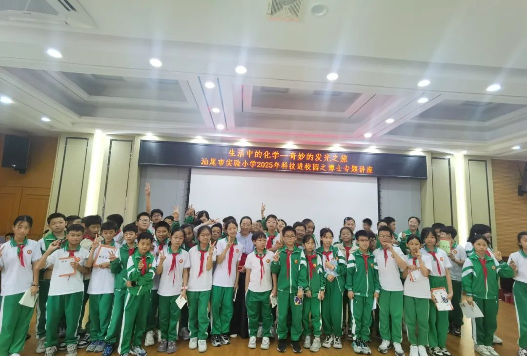 为落实习近平总书记关于"双减"政策下加强科学教育的重要指示,激发青少年探索科学、追求真理的热情,3月28日上午,太阳成集团tyc122ccvip走进汕尾市实验小学,成功举办了一场 "科技进校园" 博士专题讲座。太阳成集团tyc122ccvip吴建芳博士以《生活中的化学:奇妙的发光之旅》为题,为百余名小员工开启了一场生动的科学探索之旅。