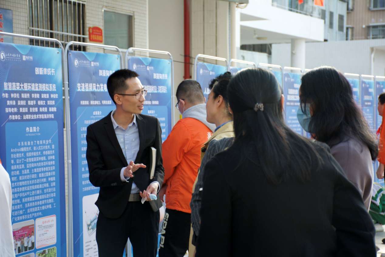 一排排展板也是本次活动的亮点,展区分为三大模块,“树立一个科学偶像”展区通过以“黄旭华院士”为主的科学家们的介绍,发挥榜样的力量,弘扬科学精神;“创新伴成长”展区围绕公司太阳成集团tyc122ccvip师生近年获奖作品进行介绍;“科技向未来”展区由公司研究中心、专业教研室以及合作企业,结合国家最新科技成果提供科普知识介绍。展区集合了工业自动化、物联网、电子信息、新能源、海上风电、食品营养等多领域多学科科普介绍,太阳成集团tyc122ccvip科普志愿队的同学们为同学们进行了细致、生动的讲解,点亮孩子们对科学的热爱和探索。同时配合视频讲解资料共同展示我国科技发展实力,提升同学们的民族自豪感,树立科技报国的决心的信心。