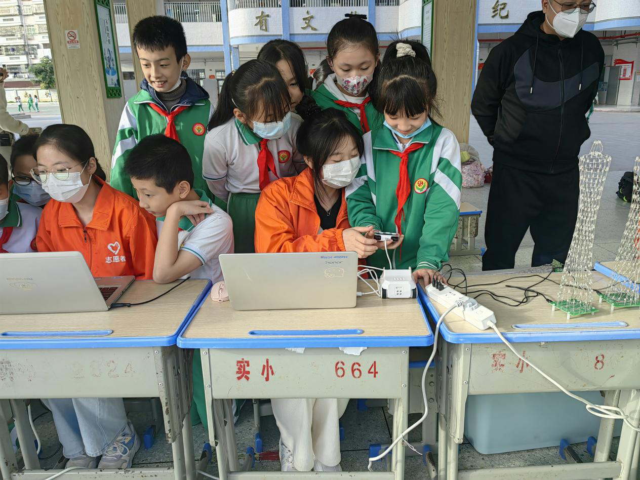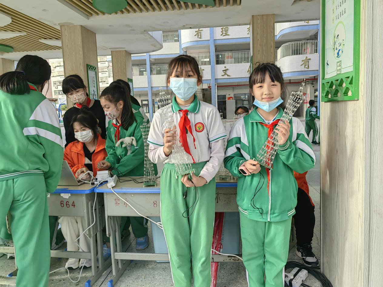 与此同时,随着手起、手落“起舞”的无人机,通过一段积木式编程即可控制微笑、舞蹈的互动机器人,一排排炫目多彩的“广州塔”吸引着同学们的目光。在科技体验区,同学们踊跃参与,体验科技的魅力。科技体验带来的不仅是新奇和欢乐,这种科技进步的发展更是让同学们对未来生活产生无限遐想,也对未来自主进行创新活动充满信心。