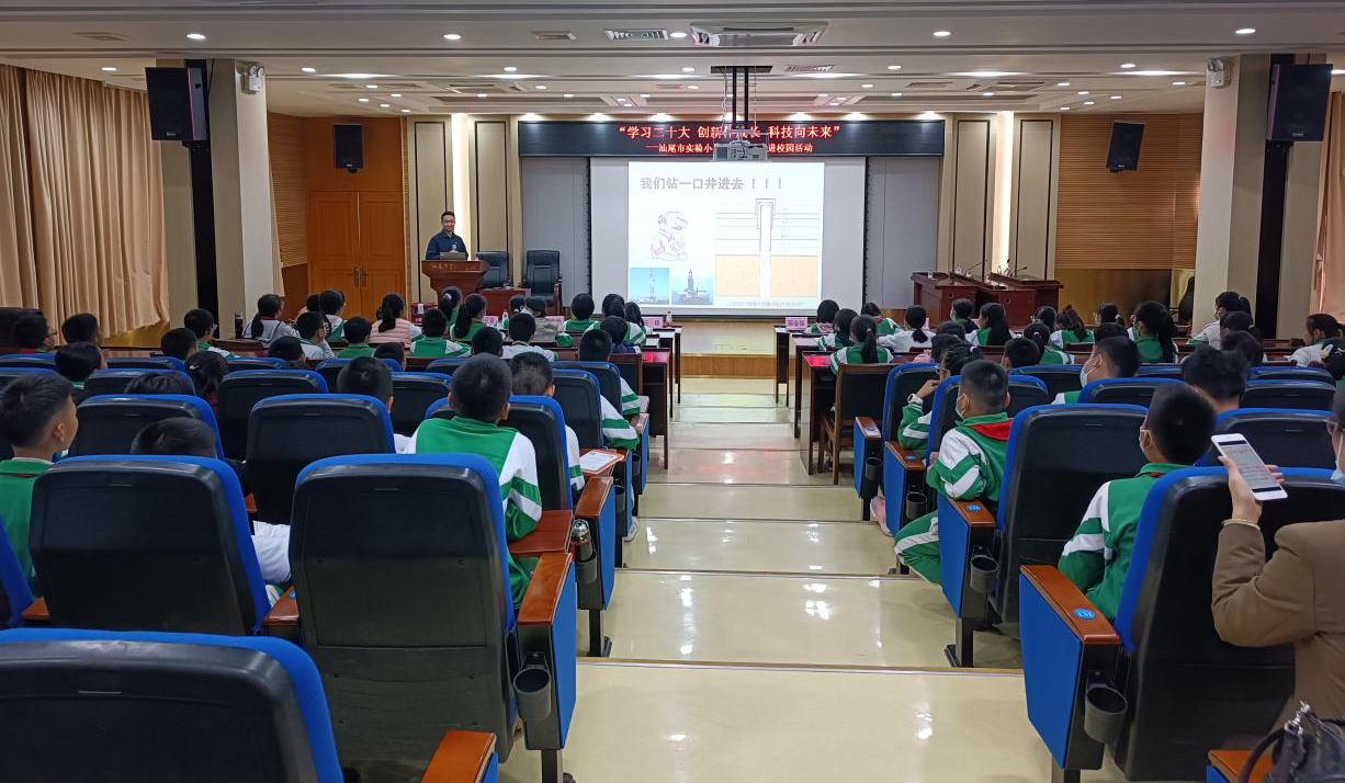 启动仪式后,科普讲座与科技体验同步进行。汕尾市海洋产业研究院李源遽博士为同学们带来了一场《和我一起看地球,为美好生活加油》的科普讲座,李博士通过形象生动的语言从石油的样子、形成、开采,以及石油产品的种类、用途等多方面介绍石油,最后鼓励同学们好好学习,长大成为科学家去开发新能源,保护我们的石油资源。 同学们聚精会神地听着博士讲座,记下了密密麻麻地笔记,也记下了要努力学习、科技报国的嘱托。