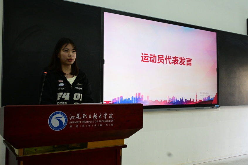 大会第三项议程,优秀运动员代表发言。优秀运动员代表陈芷欣同学发言感谢在运动会前的训练过程中公司的领导老师的关心和支持。作为一名大三即将要毕业的同学,陈芷欣今年以一金一银一铜结束了三年的校运会生涯,以后她会将对体育运动的热爱和坚持化作日常行动,勤奋学习,激情逐梦,在前进的道路上执着前行,努力做到更好!