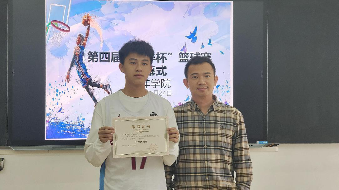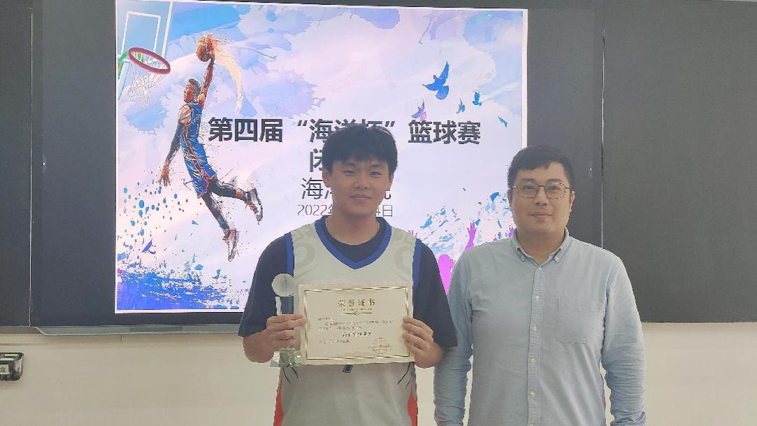 (陈老师为本届海洋杯篮球赛MVP(最具价值球员)203智能产品开发班的陈峰熠颁奖)