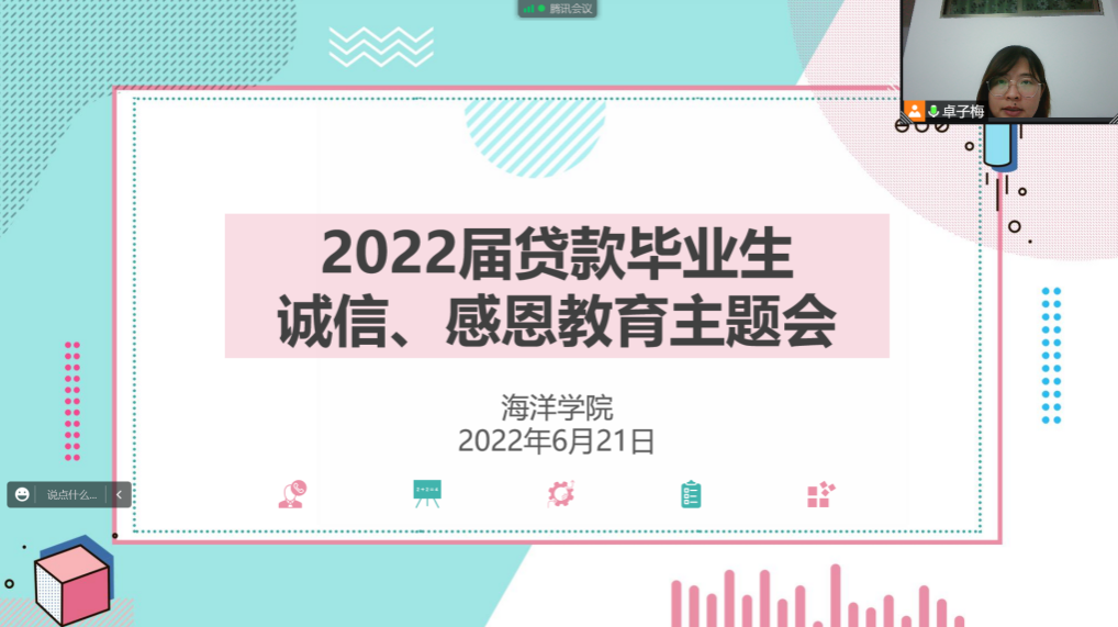 6月21日晚上,公司在腾讯会议召开“2022届贷款毕业生诚信感恩主题教育会议”,公司2022届全体贷款毕业生参加了会议。本次会议的召开,不仅提高了贷款毕业生对国家助学贷款政策等知识的了解,也增强了他们的诚信意识、感恩意识和责任意识。