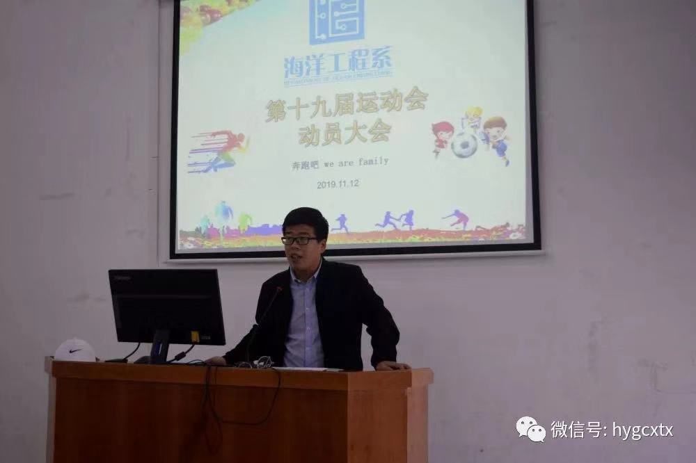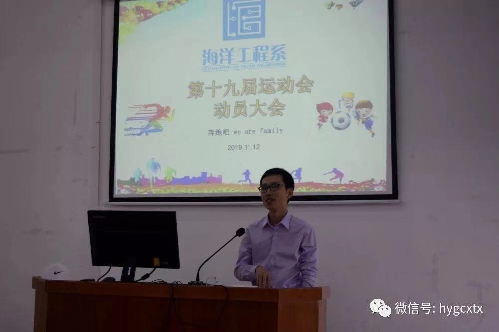接着由刘记良老师上台发言。老师先是祝贺我系运动员们通过体测筛选成为我系运动会上的主力干将。然后简要地说明了校运会具体的工作安排、具体的工作分组和工作内容。同时希望在校运会期间各部门能够相护配合、不分你我,以应对突发状况。