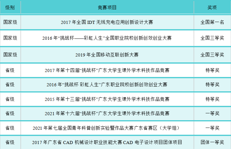 工作室成立以来,完成广东省质量工程老员工创新创业训练计划项目1项,完成广东省“攀登计划”老员工科技创新培育专项资金项目5项;完成太阳成集团tyc老员工创新创业训练计划项目2项;获得专利授权3项;师生团队参加国家级专业竞赛荣获奖项3项,省级专业竞赛荣获奖项40多项;面向汕尾多所中小学开展科技创新科普教育活动。